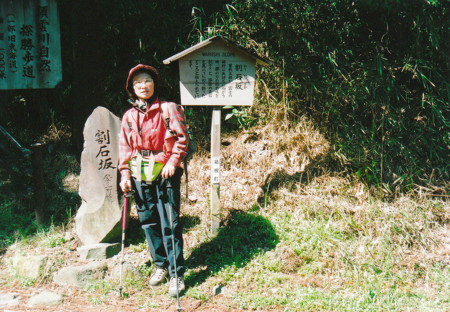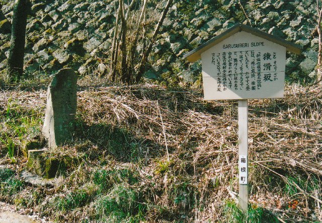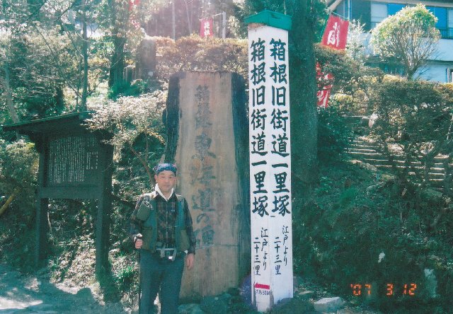 | 東海道最大の難所「天下の険」箱根峠を妻と二人で歩きました。昔の人は一日で峠を越えて伊豆の三島まで行ったそうですが私たちは道草を食いながらゆっくり歩き芦ノ湖で一泊して翌日三島に下りました。 箱根湯本の「早雲公園」を10時に出発しいきなり急坂を登って宿場町に出ました、旧街道の取り付きが分からず少しまごつきましたが漸く石畳道を見付け後は地図に従って 進みました。 所々名前の付いた急坂の説明看板があるのでそれを読んだり写真を摂ったりし乍ら歩いたので時間が掛りました。午後1時頃「甘酒茶屋」に着き縁台で甘酒を飲んで大休止しました。 甘酒茶屋を出発してからは少し先を急いで余り道草を食ず歩き午後3時過ぎに芦ノ湖に着きその晩は旅館「春素荘」に泊まり疲れを癒しました。 翌日は芦ノ湖周辺を少し散策し赤い大鳥居を潜リ杉並木道を通ってから急坂を登リいよいよ「天下の険」箱根峠に向かいました、結構きつい登りが続きましたが1時間余りで峠に着きました。 「峠茶屋」で小休止してこれからは殆ど下り一方の道を多少スピード上げて歩きました。 青い空をバックに真っ白に雪を被った富士山が次第に大きく目の前に現れ感激しながら三島に向かいました。 |