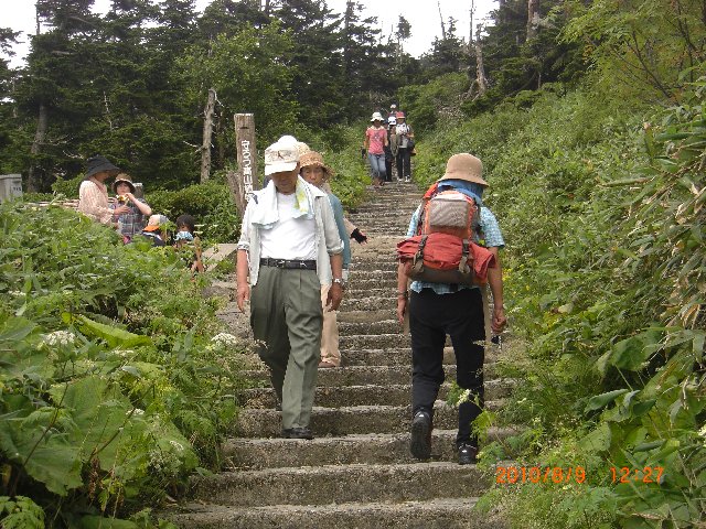| 今年二度目のお花巡りハイキングに八幡平を選びました、たまにはバスで行くことにして東京駅八重洲南口から出ている盛岡行きの夜行高速バスに乗りました。 普段は夜9時前には床に就くのに夜中(11:30)発のバスですから殆ど眠られず翌朝(6:50)に盛岡駅前に着きました、駅前の大木「枝垂れかつら」の枝が垂れ下がった木陰で朝食弁当を食べ涼しいのでうつらうつら「うたた寝」をして≒3時間過ごしました。 盛岡駅前(9:47)のバスで「八幡平頂上BT」に向かいました、頂上BT(11:50)着直ぐ昼食弁当を食べ食後休憩を兼ね売店で買い物をして過ごしました。 登山口(12:15)に取り付き所々で花の写真を撮リ乍ら登りました、大勢の観光客で賑わっていました、頂上直下から小雨が降り始めたので頂上では写真を撮って直ぐ今晩の宿「後生掛温泉」に向かって下山しました。 最初時間は掛るが花の多い長沼コースを歩く予定でしたが頂上を離れて間もなく雨は本降りになり遠雷の音もしてきたので直線コースの田代沼コースに変更しました。 頂上を離れると観光客は全く居なくなり私たち二人だけでゴーロやガレの荒れた溝の様な登山道をひたすら「雷が近づかない様に…」と祈りながら急ぎました。 蒸ノ湯温泉辺りに来た時には雨は止み雲間から青空が覗いてきました、ここからは平らで石や岩も無く多少ぬかるみもありますが歩き易い橅林の中の道でした。 又所々写真を撮り乍らのんびり歩き「後生掛温泉」(16:20)に着きました、早速かけ流しの「泡の湯」や「泥湯」、「うたせ湯]等梯子して入り疲れを洗い流しました。 翌朝も「朝湯」に入り宿近くのBT(8:26)発のバスで途中「玉川温泉」、「新玉川温泉」等を廻り田沢湖駅(10:28)に着きました、同駅(11:02)発(こまち12号)で東京に向かいました、自宅着(15:50)でした。 今回も雨に降られてお花畑巡りも十分出来なかったけれどサービスの良い宿で温泉に入れて「まぁまぁ満足」な山旅でした。 |