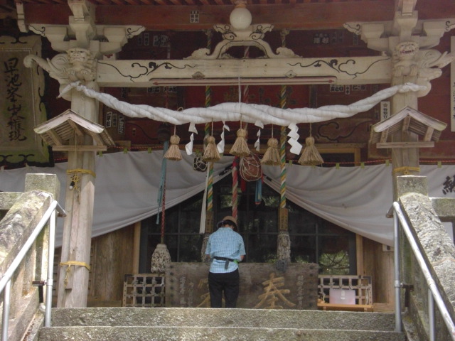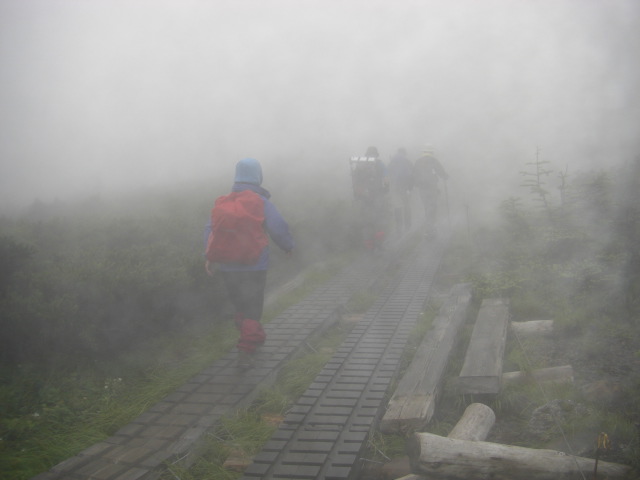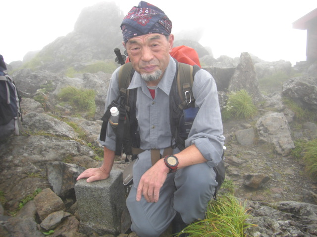 | 湿原の木道を歩く | 5合目で小休止 | 頂上の避難小屋 | 頂上の三角点 | 頂上 奥宮の祠前で |