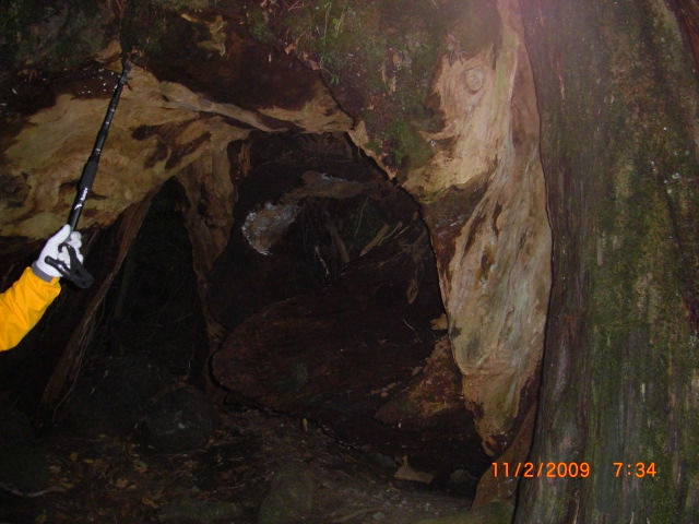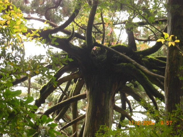 | ウイルソン株 | ウイルソン株の中の祠 | 逆さの様な杉の大木 | 大岩の上を登る | 大王杉の巨木 |