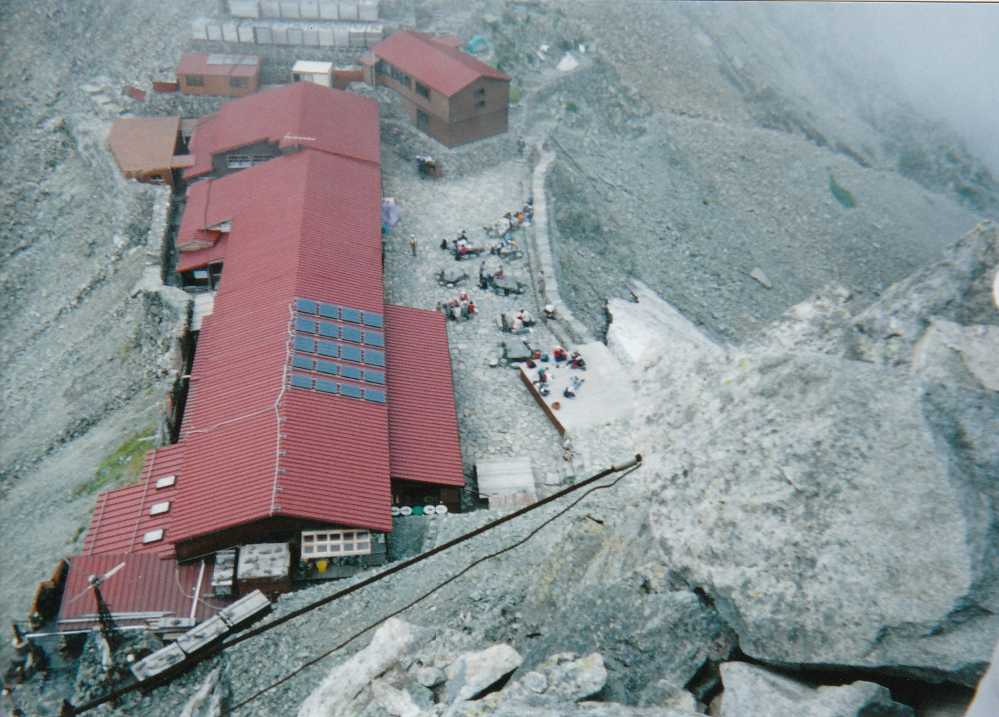 | 奥穂高岳から俯瞰の山荘 | 奥穂高岳頂上にて | 吊り尾根から俯瞰の涸沢雪渓 | 紀美子平で小休止 | 前穂高岳の岩場を登る | 前穂高岳頂上にて |