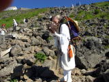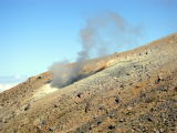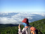| 神社の大鳥居(登山口) | 岩場の階段を上る妻 | 法螺貝を吹く山伏 | 中腹から眺める雲海 | 頂上直下の噴火口 |