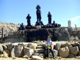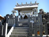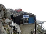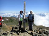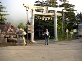 | 頂上直下の雪渓 | 御嶽山頂上の二人 | 頂上の御嶽神社奥宮 | 中腹にある巨大な仏像 | 覚明堂休憩所 |