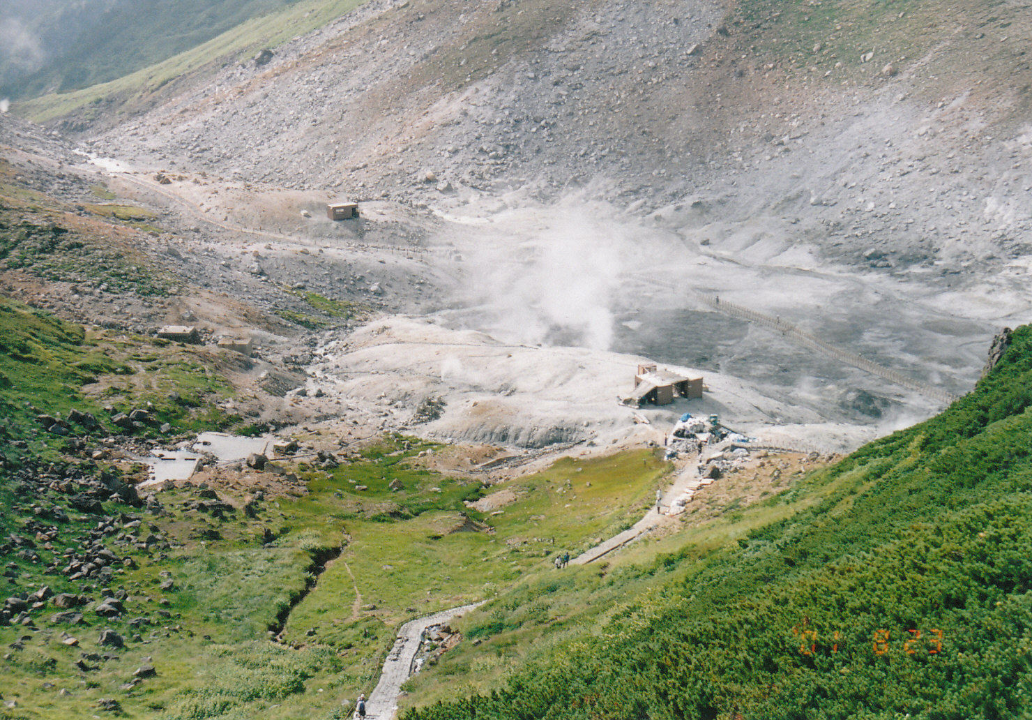 | 黒部ダムの見学に行こうと思ったのでそれならば立山に登ろうと言うことになったのです。扇沢からトロリーバスで入りその日は日本一高所の温泉「みくりが池温泉」に泊まりました。 夜になって妻が軽い高山病に罹り心配しましたが、翌朝には回復したので二人で登りました、「みくりが池温泉」を8時に出発して途中花の写真を撮り乍らのんびり歩いて9時半頃「一の越」に着きここで休憩した後ガレ場の急坂を登り11時ごろ頂上に着きました。 頂上の「雄山神社」で宮司さんの祝詞に併せお祈りした後稜線を歩いて「大汝山」に行き大きな岩の頂上に登りました、「富士の折立」にも行く予定でしたが止めて引き返し頂上の「社務所」でお弁当を食べ下山しました。 帰りは室堂から富山側にバスで美女平まで行きそこからケーブルカーに乗り換え「富山地方鉄道」の立山駅に下りました、立山駅から電車で魚津に行き「魚津温泉」旅館に泊まりました。 翌日は宇名月からトロッコ電車に乗る予定でしたが時間の都合で中止して糸魚川から大糸線周りで帰りました。 |