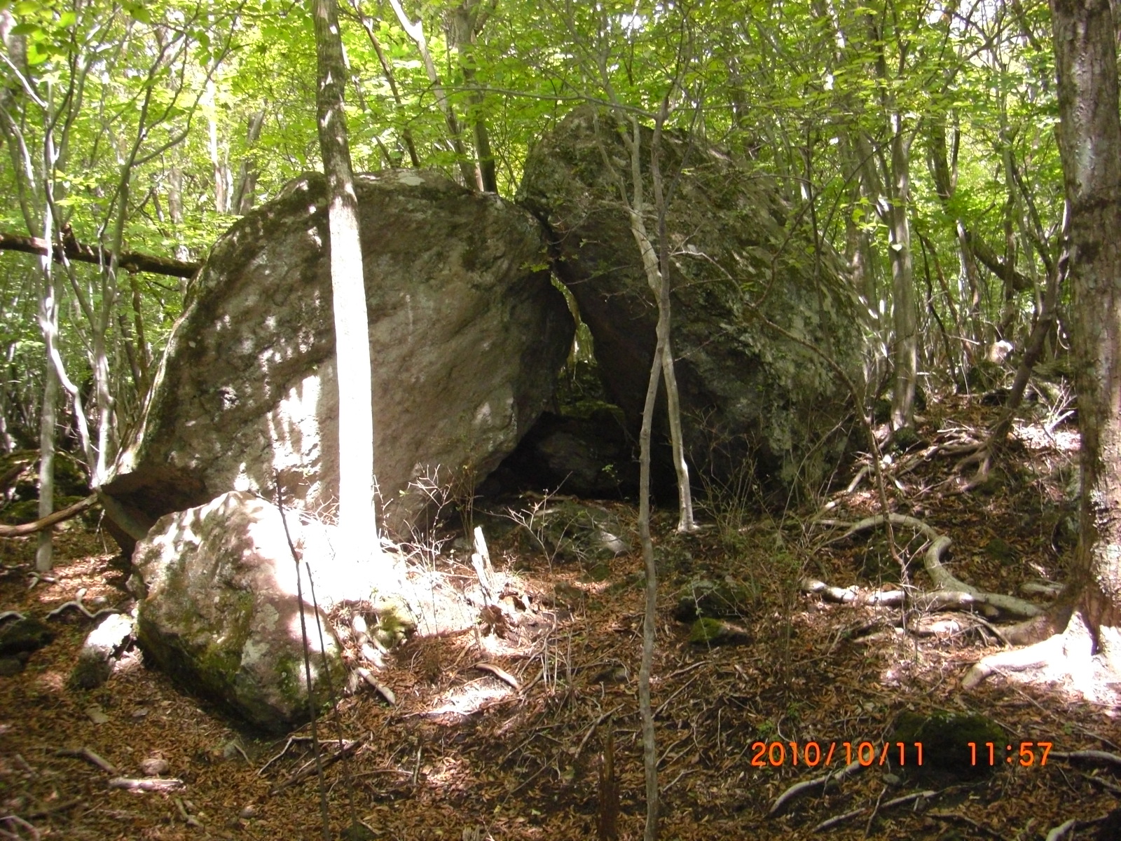 | 合野越展望台(1) | 合野越展望台(2) | 中腹に鎮座する巨石 | 樹林の中を登る | 中腹から見た山並み | 西峰と東峰のコル「マタエ」 |