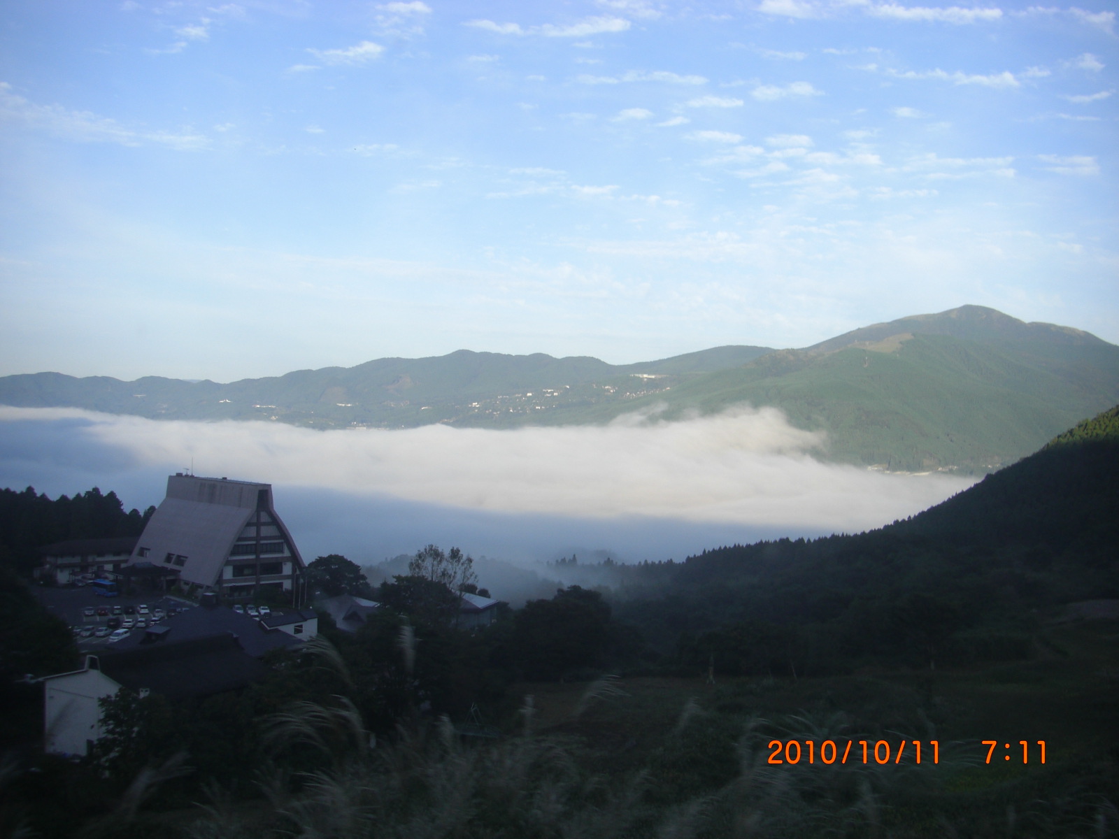 | 初日宿 「上の杜」 | 早朝の湯布院街 | 霧に覆われた湯布院の街 | 由布岳登山口 | 登山口から見た由布岳 | 登山口から見た鶴見岳 |