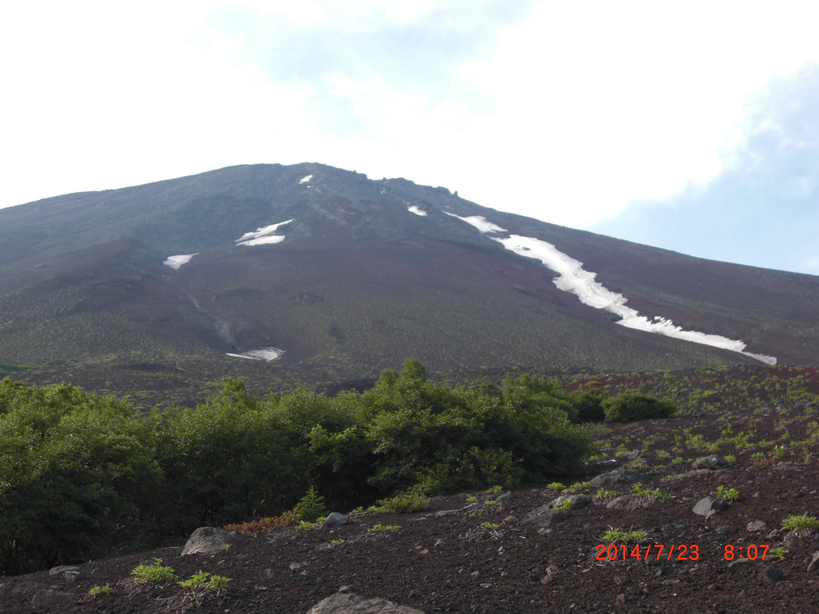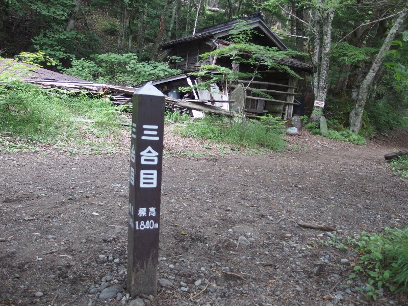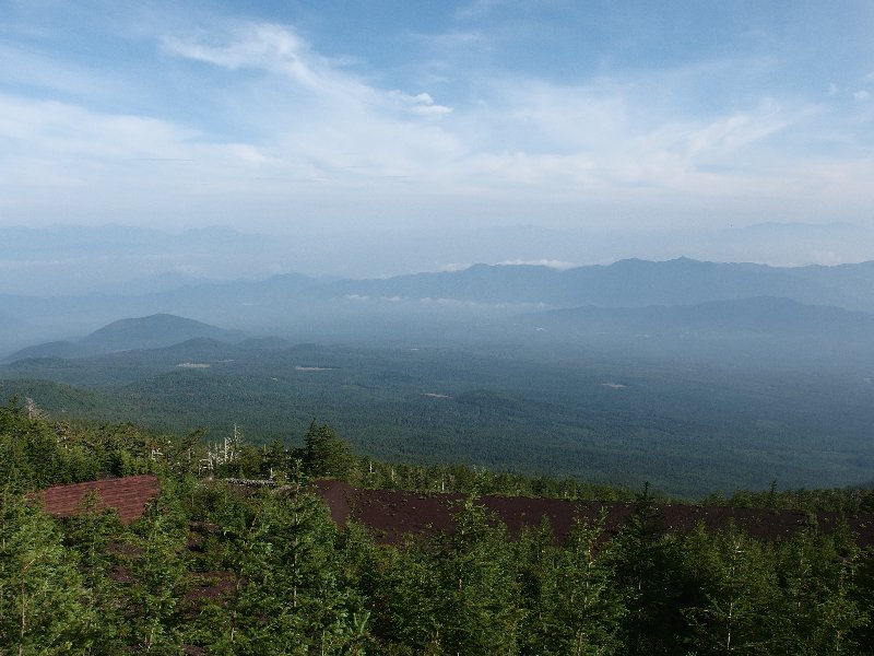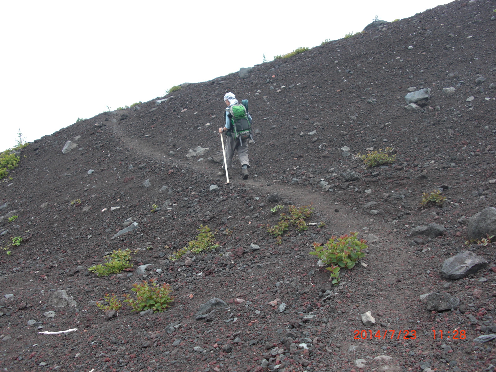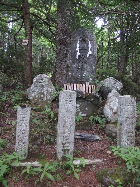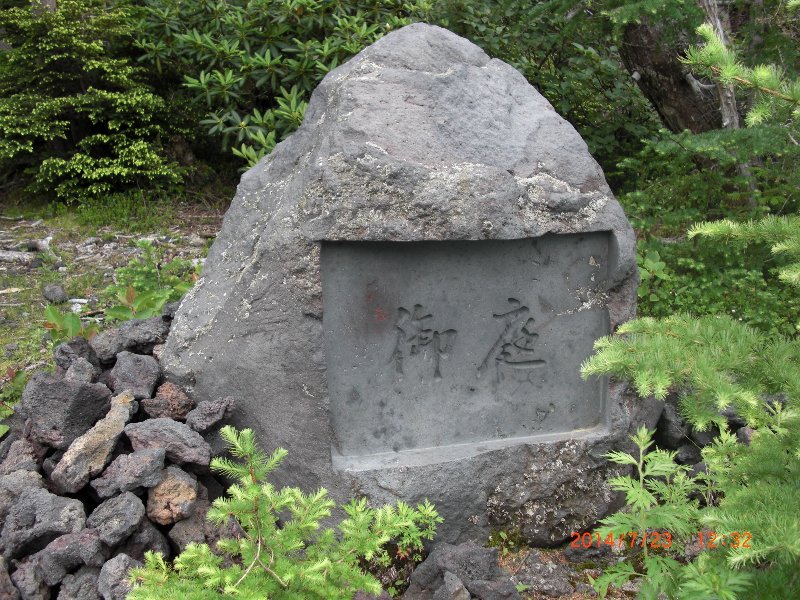 | 13年前妻と二人で登った時は五合目からでしたので今回麓から歩いて五合目迄登ったことで全行程歩行登山が繫がったことになります、私は数十年前の青年時代村の青年団の中間と浅間神社にお参りして登頂しましたし4年前には単独で麓から剣ヶ峰迄登っていますから今回で通算3回全行程歩行登山をしたことになります。 初日五合目佐藤小屋までの登りは予想以上に苦戦しましたので二日目は水平道だしおそらくよく整備された道だろうと楽観していたら現実は甘いものではありませんでした、確かに御庭分岐までの約3km程は遊歩道として石の敷き詰めた道でしたが分岐から先は木の根やゴーロの上を歩く登山道でした。 特にザレ、ガレ、ゴーロ等の沢をトラバースするのはいつ上から岩が落ちてくるか分かりませんから急いで通過しなければなりません、終点間近の沢に出た時突然踏み跡が途絶えてしまいました、がけ崩れで道が無くなったのです、然しどこを見てもトレールはありません仕方なく妻を待機させて私だけで崩れた崖をトラバースしようと試みましたが突然足元の小さい岩が崩れ落ちたのでこれ以上無理と思って進むのを諦め引き返すことにしました。 妻の所に帰ると妻が「道が向うに有るようだよ…」と指差す方向をよく見ると確かに踏み跡らしいラインが高巻きしてありました、踏み跡を辿って行くと所々に人の手ガ加えられた跡の有るトレースでした、これで全コース完歩出来ることになったのです、いつもどんな山でも決して舐めて掛ってはなりません、 反省!! |