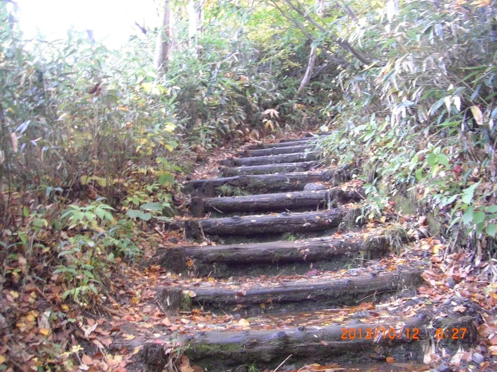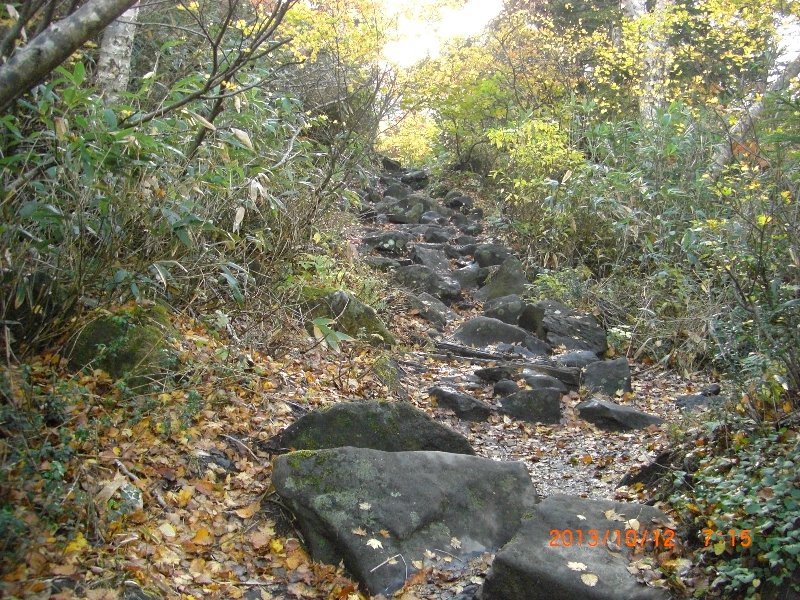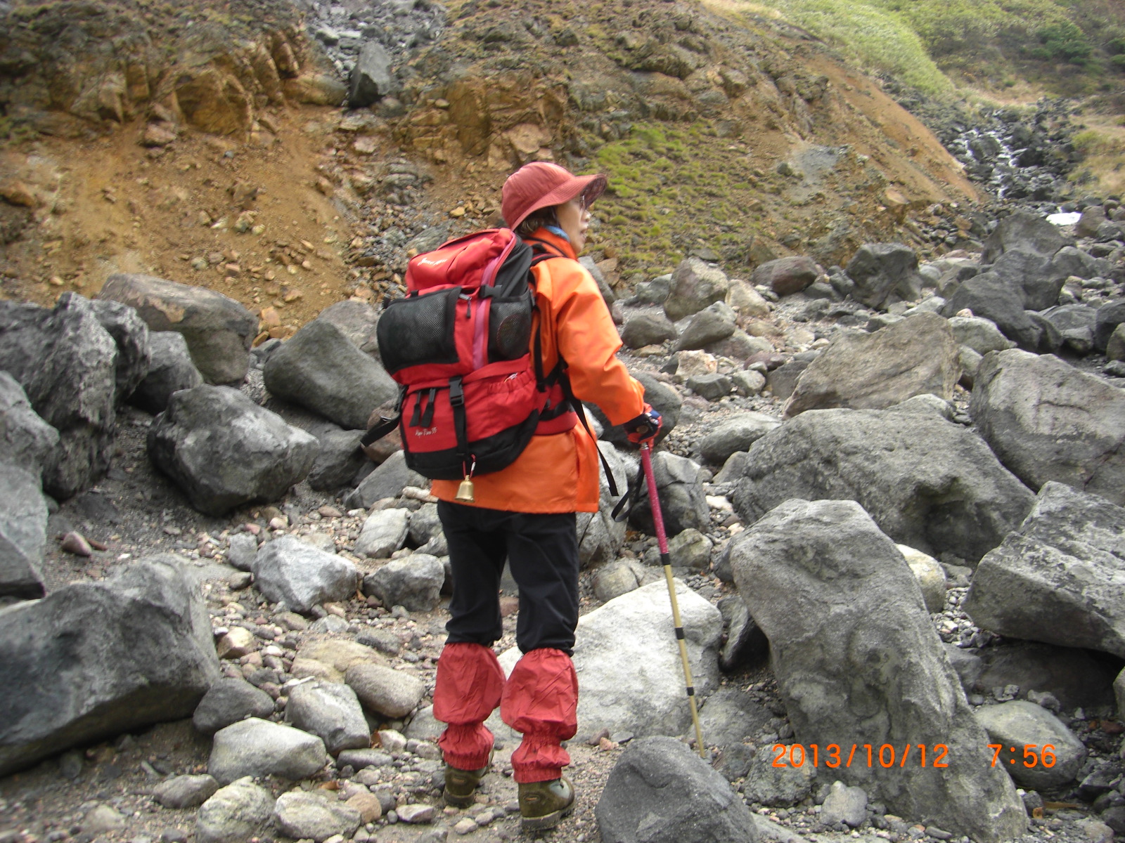 | 前泊宿「酸ヶ湯温泉」 | 登山道入口の階段 | 整備された登山道 | ゴーロの登山道 | ヤマユリの種 | ガレ沢を渡る |