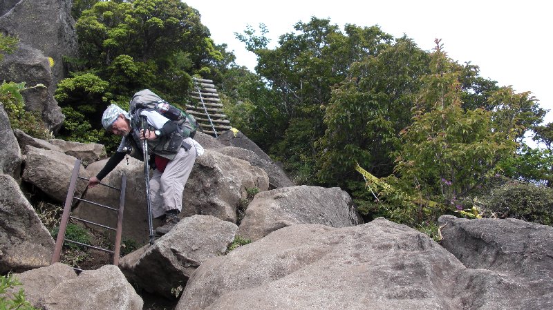 | 登山道を飾るミヤマキリシマ | ツクシドウダン | 狭い岩間を通る | 岩場の梯子を下りる | 久住山頂上にて | Ⅰ△「久住山」 |