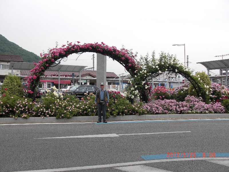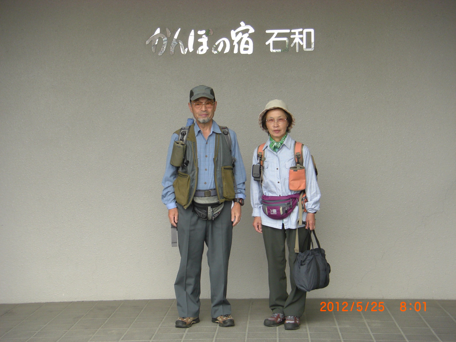 | 旧街道の「桃の木茶屋跡」 | 景色を眺めて昼食休憩 | 石和温泉駅前のバラアーチにて | 宿 「かんぽの宿石和」 にて | 宿の中庭で遊ぶカルガモの親子 |