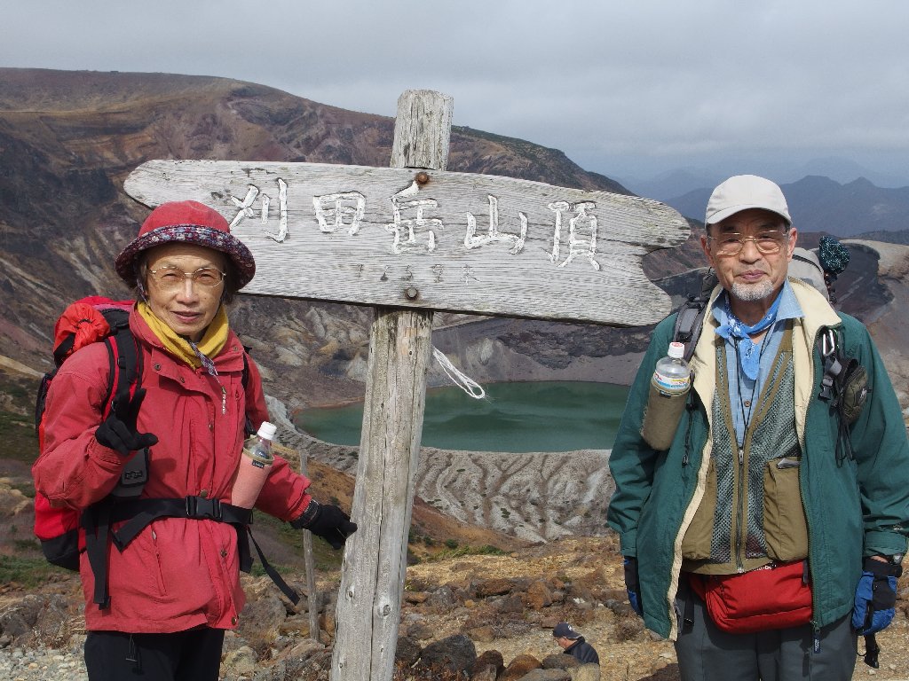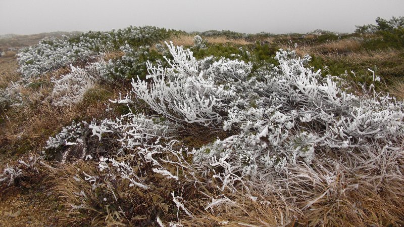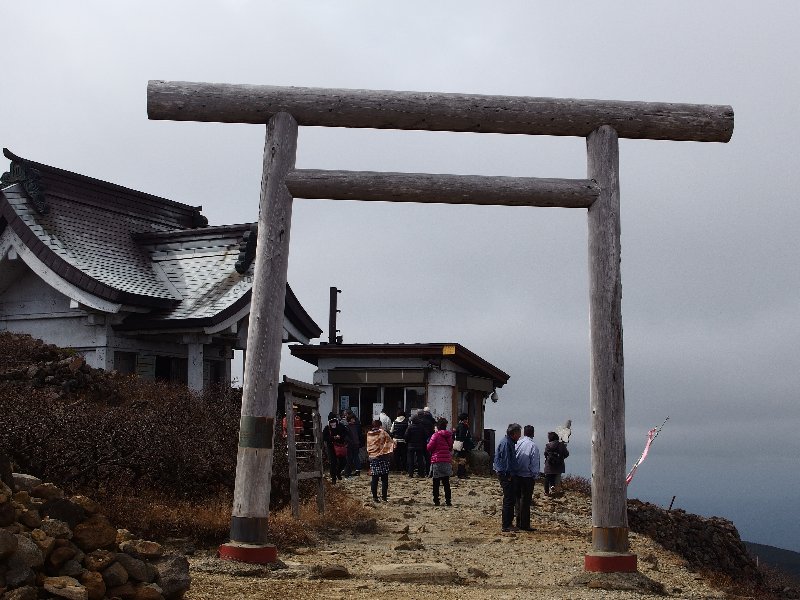 | 刈田嶺神社 | 刈田岳頂上にて | 噴火口の御釜 | 強風の稜線を行く | 霜に覆われた這松 | 熊野神社 |
